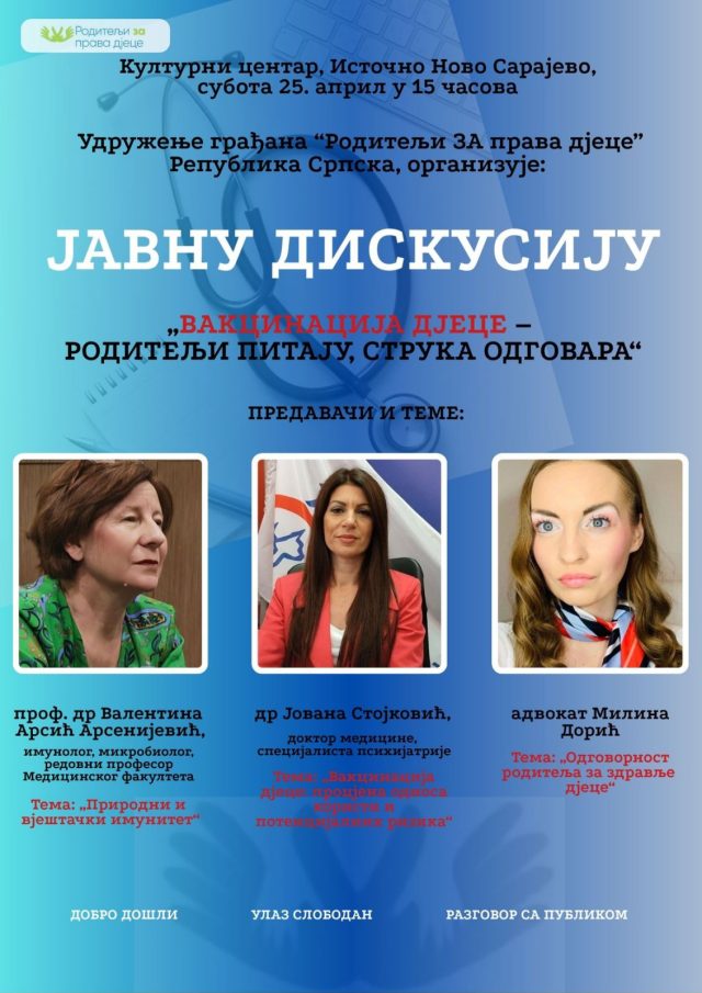 Јавна дискусија „Вакцинација д‌јеце – родитељи питају, струка одговара“ у Источном Новом Сарајеву, 25.4. (Видео)